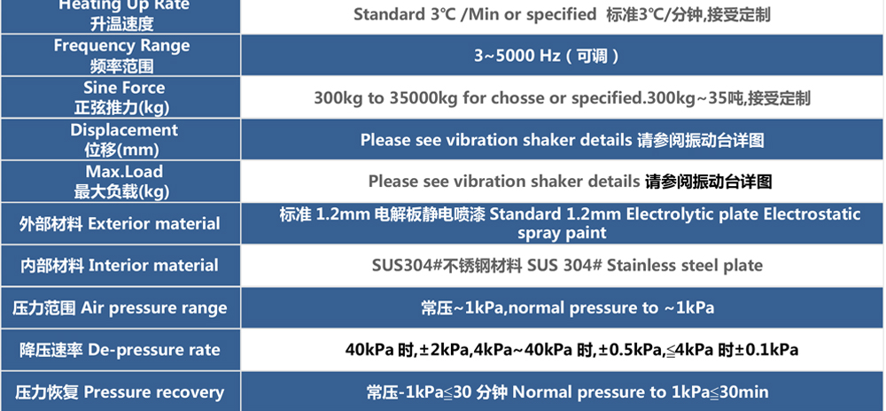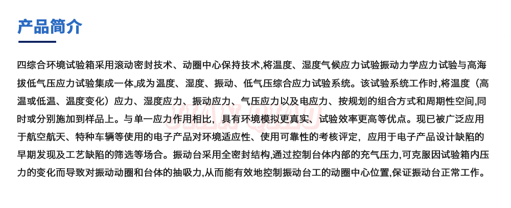 用途:四綜合環(huán)境試驗(yàn)箱采用滾動(dòng)密封技術(shù)、動(dòng)圈中心保持技術(shù),將溫度、濕度氣候應(yīng)力試驗(yàn)振動(dòng)力學(xué)應(yīng)力試驗(yàn)與高海拔低氣壓應(yīng)力試驗(yàn)集成一體,成為溫度、濕度、振動(dòng)、低氣壓綜合應(yīng)力試驗(yàn)系