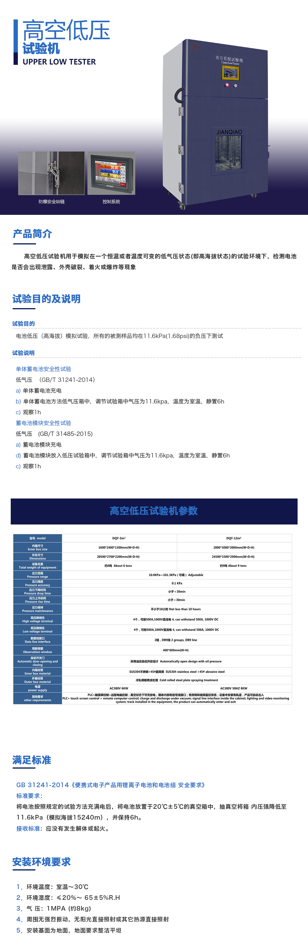 用途:高空低壓試驗機用于模擬在一個恒溫或者溫度可變的低氣壓狀態(tài)(即高海拔狀態(tài))的試驗環(huán)境下,檢測電池是否會出現(xiàn)泄露、外殼破裂、著火或爆炸等現(xiàn)象。