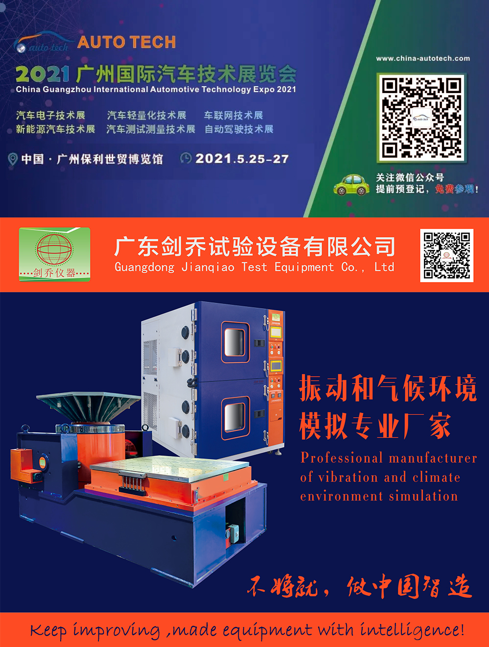 2021年5月25-27日,廣東劍喬試驗設備有限公司【劍喬儀器】將攜旗下最新試驗設備亮相AUTO TECH 2021 中國·廣州第八屆國際汽車技術展覽會,現場展示:振動試驗系統、溫濕度振動三綜合箱、高低溫防爆試驗箱高加速沖擊試驗臺、電池熱濫用試驗機、電池短路試驗箱、等試驗設備及動力電池相關試驗解決方案。