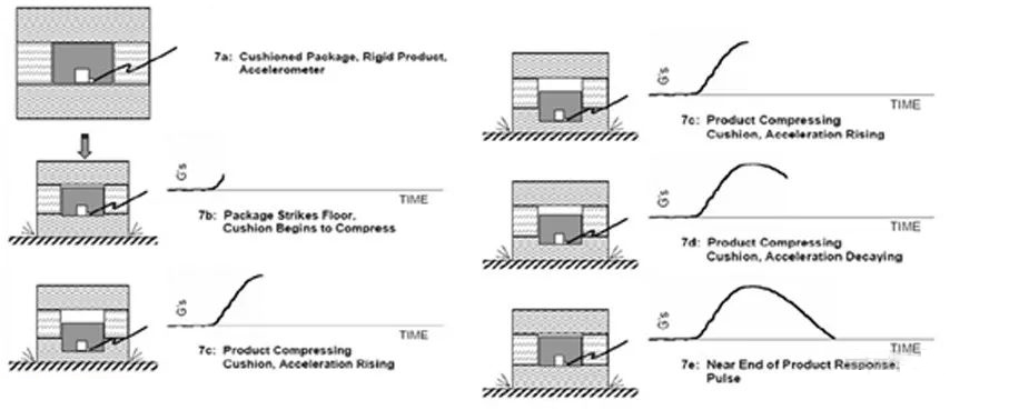 我們把產(chǎn)品受到?jīng)_擊一瞬間的整個(gè)過(guò)程分解開來(lái),產(chǎn)品受到?jīng)_擊的過(guò)程大致如下圖,通過(guò)下面的圖片我們可以清晰的感受到產(chǎn)品受到撞擊或者跌落的一瞬間產(chǎn)品被壓縮,再把應(yīng)力釋放的整個(gè)過(guò)程: